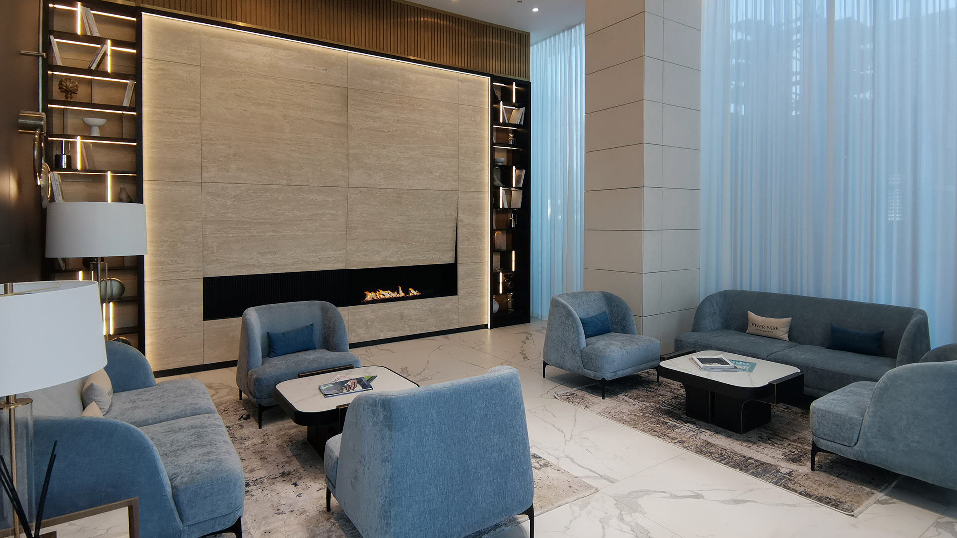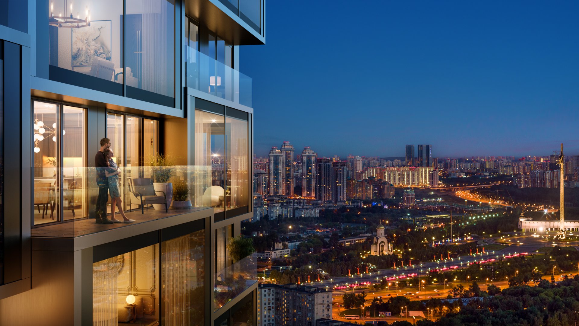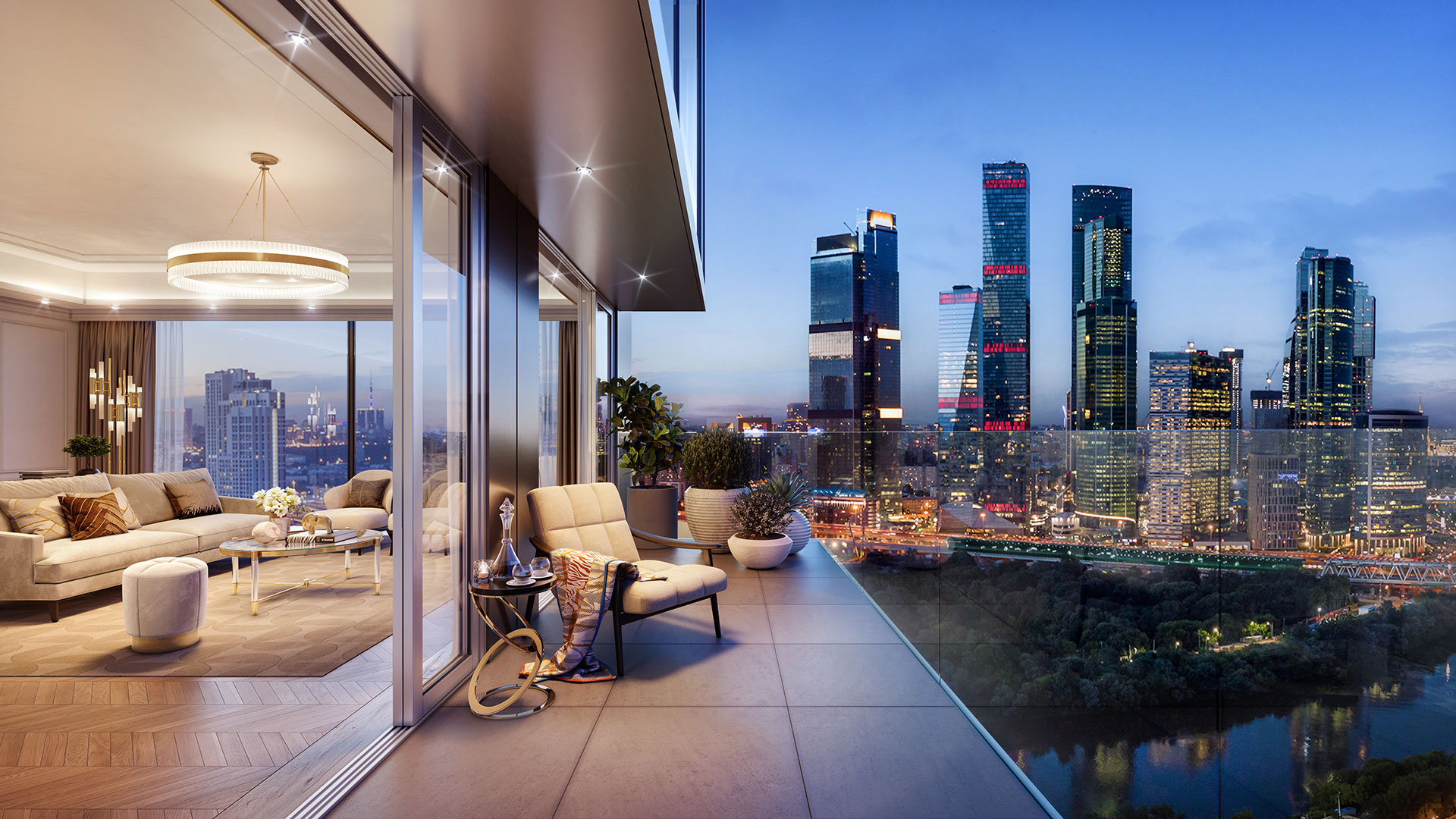 Экстра-высокие даже для премиум-класса потолки, огромные окна шириной до 3м, террасы и балконы в небоскребах делают проект поистине уникальным. Из большинства квартир открываются впечатляющие виды на реку, Москва-Сити, Парк Победы, Кутузовский проспект, гостиницу Украина и МГУ.