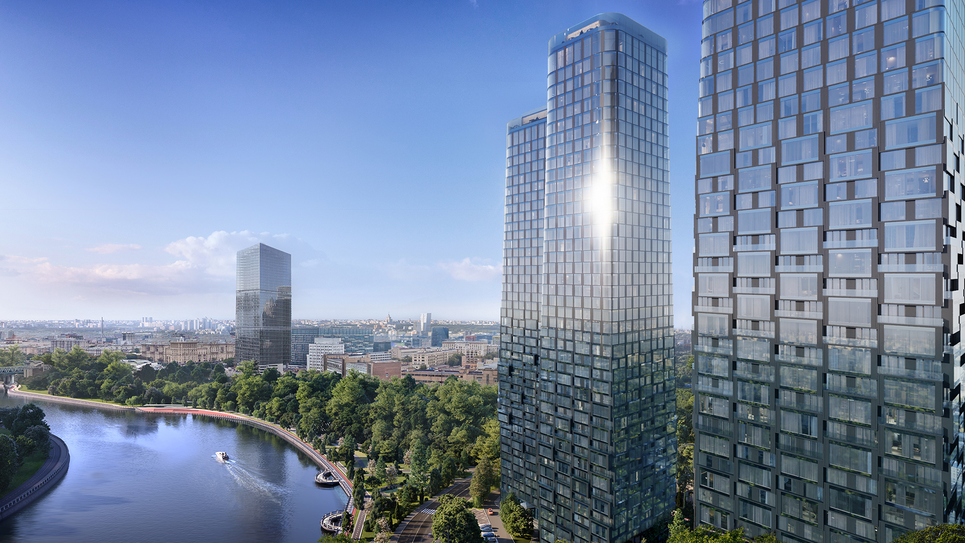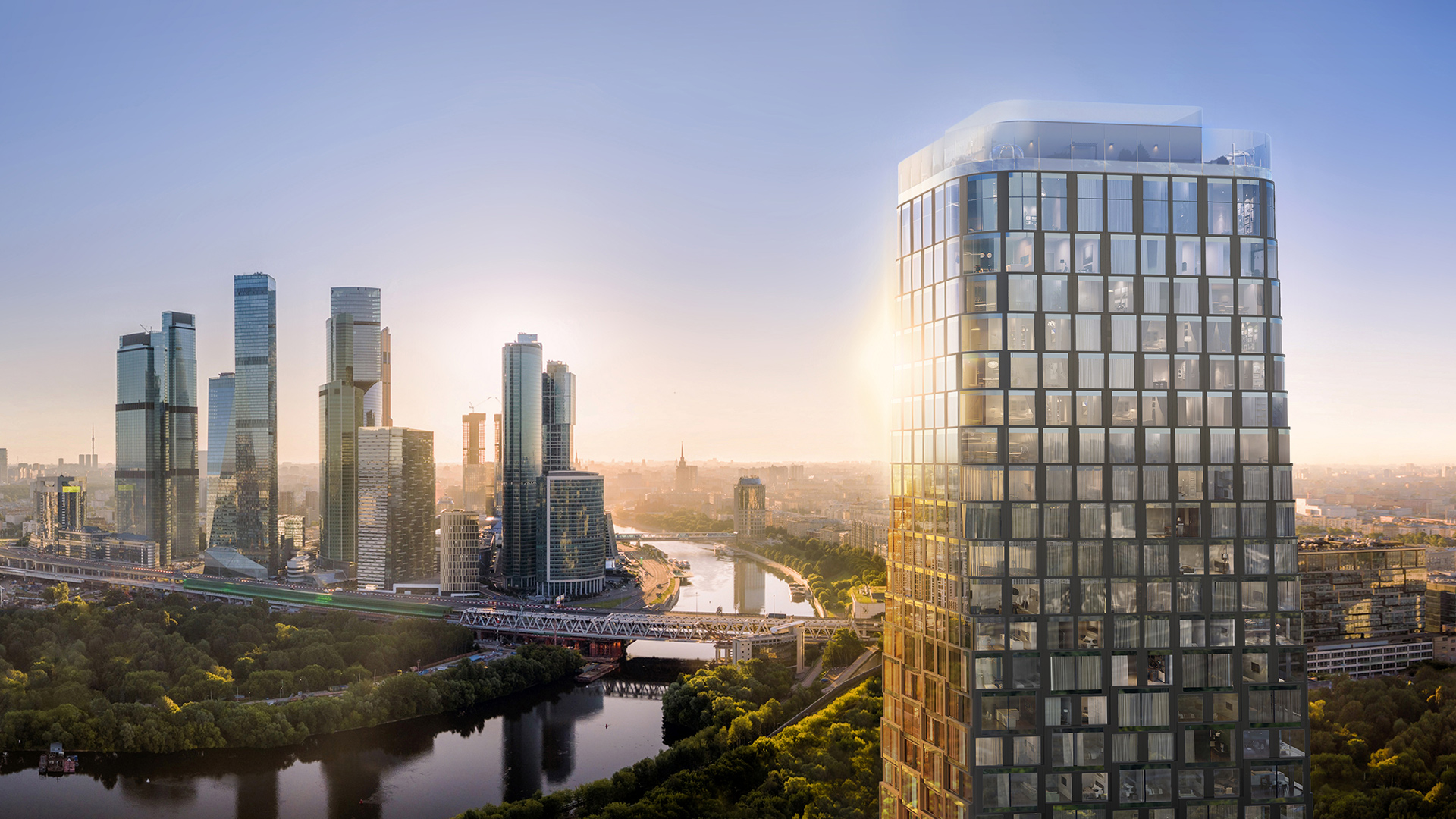 River Park Кутузовский — это будущее Кутузовского проспекта, эко-футуризм в архитектуре и новый уровень премиального комфорта для семей. 5 башен-небоскребов по 45-46 этажей объединены единым основанием с подземным паркингом и зеленым внутренним двором. Архитектура от именитого бюро ADM отличается уникальной пластикой фасадов — башни словно парят в воздухе, играя гранями как драгоценные камни.