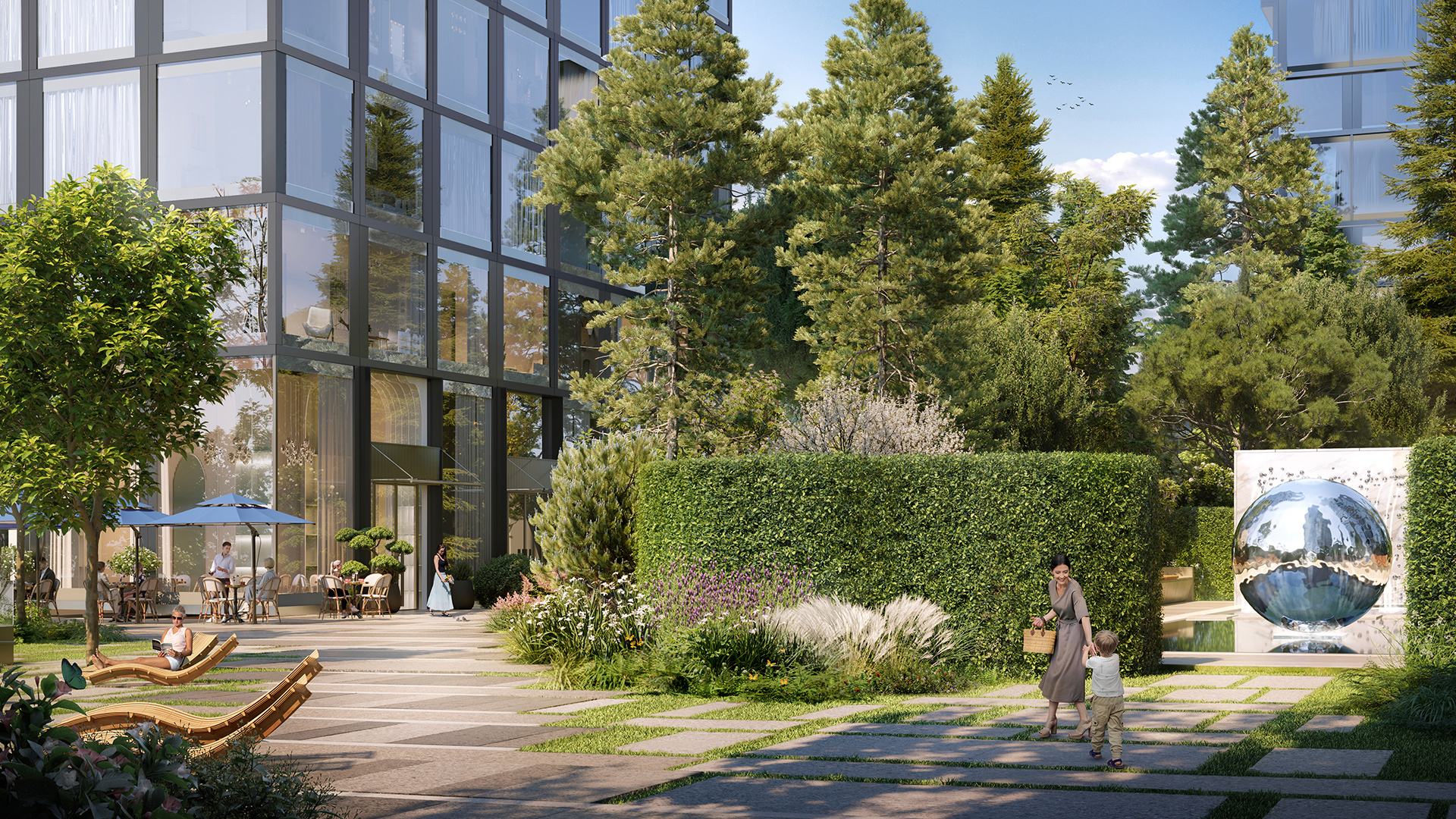 Внутренний двор в 2 га разработан мировым экспертом — бюро WEST8. Концепция проекта — дать жителям отдохнуть от городского ритма, расслабиться среди природы и натуральных материалов. Детские площадки, workout и спортивная игровая площадка, эффектный зеркальный пруд, picnic area и party lounge, солярий и цветущий сад — всему нашлось место в просторном зеленом дворе под большими деревьями.